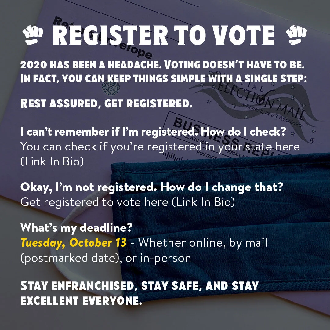 For some of us, November 3rd can’t come fast enough. For others, things may seem more complicated. Maybe things are crazy at work or school. Or worse—maybe nonexistent. Maybe you’ve just moved away, moved back, or moved temporarily. Hey, there’s a pandemic going on—everything seems trickier, including voting.